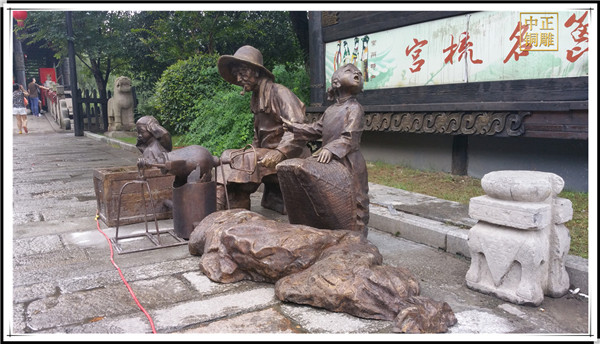 打燒餅、爆米花、剃頭挑和兒童游戲“斗雞”。一組組精美的雕塑,猶如一幅幅生動形象的立體素描,把人物的每一個動作、每一個眼神甚至每一個表情都刻畫出來了,因此,這些雕塑所表現的場景自然也就鮮活起來,很容易被大家接受并喜愛。這樣的雕塑最能引起人們的共鳴,因為它不僅提升了城市文化品位,還讓大家找回了童年記憶,找回那份曾經的純真,我覺得這是最難得的。