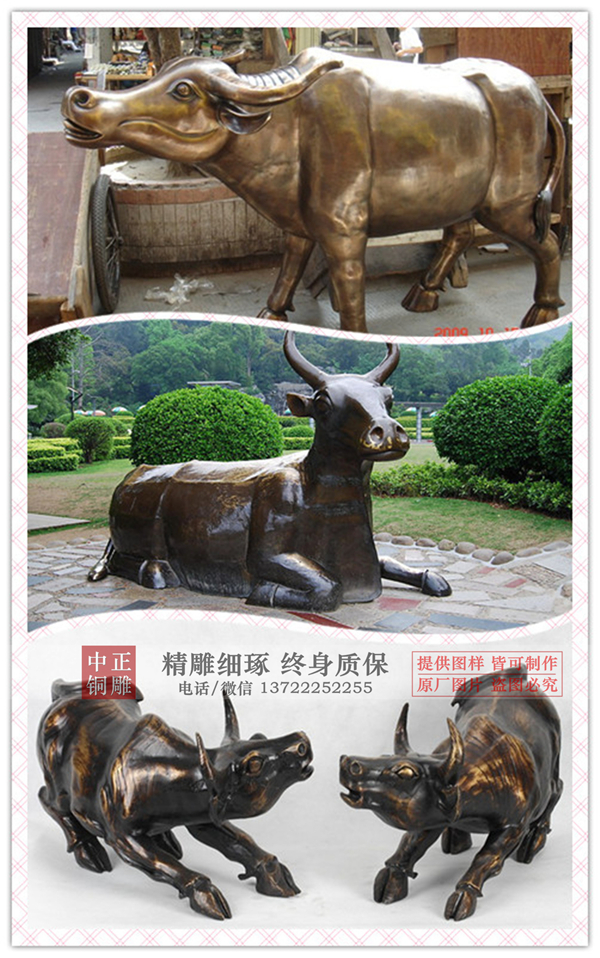 牛推動了農(nóng)耕時代的社會發(fā)展。那個農(nóng)耕時代,牛的辛勤付出,生產(chǎn)了豐富的五谷雜糧,養(yǎng)育著從事百業(yè)生產(chǎn)勞作的勞動人民,養(yǎng)育著整個人類社會。盡管耕牛已經(jīng)退出了農(nóng)業(yè)生產(chǎn)第一線,退出了歷史舞臺,但農(nóng)耕精神和耕牛的任勞任怨卻成為人們永遠的精神財富,永遠激勵人們勇敢地去拼搏進取,開創(chuàng)美好的生活,開創(chuàng)美麗的未來。中正銅雕-廠家直銷銅牛雕塑,加工廠家直銷銅牛雕塑,定做廠家直銷銅牛雕塑,我司愿與天下有識之士,真誠相待、真情相融,共謀進取、共創(chuàng)輝煌!以優(yōu)質(zhì)的工藝和設(shè)備與科學(xué)規(guī)范的管理相結(jié)合是我們中正銅雕塑質(zhì)量創(chuàng)造工藝名牌的基礎(chǔ)。