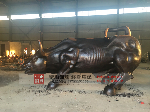牛給人的印象,是一種溫順而踏實的動物,肯吃苦、憨厚樸實,是人類的好幫手,而銅牛雕塑的多樣造型,具有著力量與旺財的象征意義,尤其在現代化的今天,銅牛雕塑更被賦予了開拓創新、積極進取、團結奉獻的精神意義,所以說,銅牛雕塑不僅僅是一種雕塑產品,更是一種精神的象征,能夠給人以思想上的激勵,在企業當中尤為適用。中正銅雕-華爾街銅牛雕塑廠家,定做華爾街銅牛雕塑廠家,大型華爾街銅牛雕塑廠家,唐縣中正銅雕工藝品廠是鑄銅雕塑的廠家。擁有設計師和雕塑團隊,引進的鑄造技術,開發出一系列的藝術性銅制工藝品。