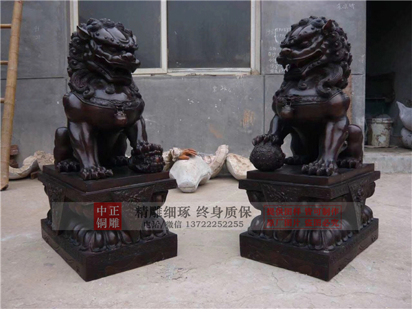 銅獅子也有等級(jí)之分。七品以上官門口才允許設(shè)銅獅子,而銅獅子的等級(jí),便是由它們滿頭的“卷發(fā)”來(lái)判斷的。一品官員門口的銅獅子,頭上有十三個(gè)“卷發(fā)”,也被稱為“十三太保”,二品官員門口的銅獅子,頭上便減少一個(gè)“卷”,以此類推,官員等級(jí)每向下降一級(jí),獅子頭上的“卷發(fā)”便少一個(gè)。可想而知,皇宮門口的銅獅子,頭上的“卷發(fā)”是最多,有45個(gè),這自然是象征著皇帝“九五之尊”不可動(dòng)搖的地位。中正銅雕-故宮獅子現(xiàn)貨,大型故宮獅子現(xiàn)貨,定做故宮獅子現(xiàn)貨,我廠是一家以設(shè)計(jì)、制作、安裝為一體的發(fā)展型企業(yè)。公司坐落在中國(guó)銅雕之鄉(xiāng)---河北唐縣,成立于1984年。公司自成立以來(lái),以優(yōu)質(zhì)的雕塑工藝,優(yōu)異的性價(jià)比,一體化的銷售網(wǎng)絡(luò),高效、完善的售后服務(wù),飛速發(fā)展。成為了擁有設(shè)計(jì)、銷售、生產(chǎn)、安裝、維護(hù)為一體的銅雕塑制作商。